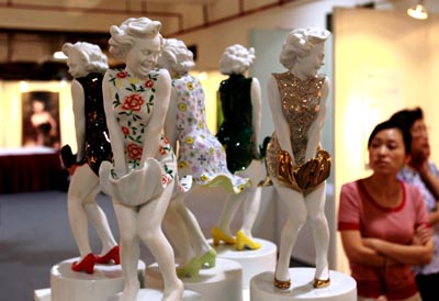 第十四届上海艺术博览会日前举行开幕预展。此次艺博会的主题是“让收藏成为风尚”,汇聚了来自中国、德国、法国等14个国家的126家画廊前来参展。在展出的作品中,不仅有罗丹、毕加索、达利、莫奈等世界艺术大师的原作,还有张大千、齐白石等收藏家梦寐以求的中国大师的精彩画卷,当代艺术的名家陈逸飞、罗中立、陈丹青等的佳作也纷纷登场。全场约有6000余件油画、国画、版画、雕塑、水彩、摄影、装置、陶瓷等作品供艺术品收藏者选购。图为观众在欣赏陶瓷雕塑作品《梦露的中国梦》。
