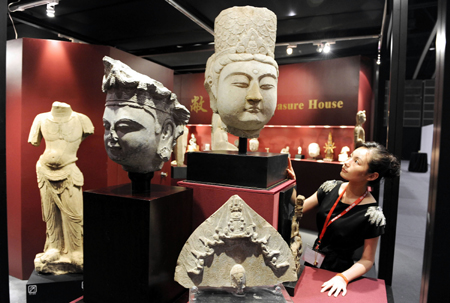 10月3至6日,亚洲最顶尖的古玩及艺术品博览会——香港国际古玩及艺术品博览(“FINEARTASIA2010”)在香港会展中心举办,呈献约5000件跨越古今与东西方之艺术珍品,全场总值高达5亿港元。图为香港乾坤堂收藏的唐朝大理石雕塑《菩萨头像》(上),价值达380万港元。