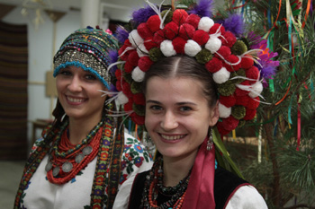乌克兰传统婚礼服装样式很独特,新娘的服装一般只在紧身衬裙外罩一条羊毛短裙,衬裙上有各色图案;上身着深红色、绿色或蓝色天鹅绒或羊毛料的无袖上衣。上衣前襟部分交叠,用扣子扣住;脚穿红色长靴;颈上挂好几串彩色珠子或项链。在头上带有花环和配有各色的彩带。这种独特的着装为乌克兰的婚礼增添了不少民俗气息。