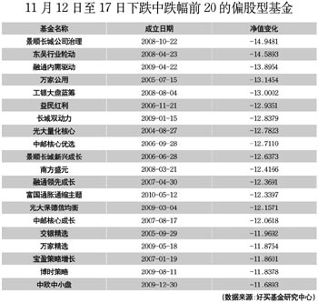 从具体的基金来看,本轮12日至17日跌幅居前20的偏股型基金中,景顺长城公司治理、东吴行业轮动、融通内需驱动、万家公用分别以-14.9481%、-14.5893%、-13.8954%、-13.1454%位居跌幅前四位。