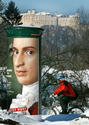 如今在萨尔茨堡,莫扎特的影子无处不在,莫扎特巧克力球、莫扎特酒、莫扎特大学、莫扎特街……莫扎特是萨尔茨堡的骄傲,也是奥地利人的骄傲。奥地利人还将莫扎特的头像铸在1欧元硬币的背面,让它流传世界。