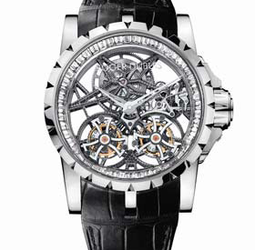 EXCALIBUR系列暗藏创新元素:宽裕的尺码、品牌独有的三段式表耳、精美的表冠保护装置及凹纹表圈,设计一望而知;不同表款分别装配最复杂的顶级机芯;其后几年,ROGER