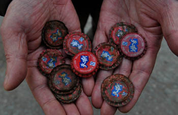 2010年12月7日,今年73岁的李培全手捧废弃厂房留下的天府可乐瓶盖唏嘘不已。新华社记者 杨磊