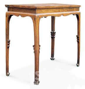 此桌腿足上端不露明,唯仍为高束腰式。牙条以下,壸门式轮廓非常完整。腿足中部花叶突出处,断面作曲尺形,即所谓挖缺作。马蹄有一双向上翘起的尖足。这些都是壸门床遗留的痕迹,可以帮助我们去追溯有束腰家具的渊源。