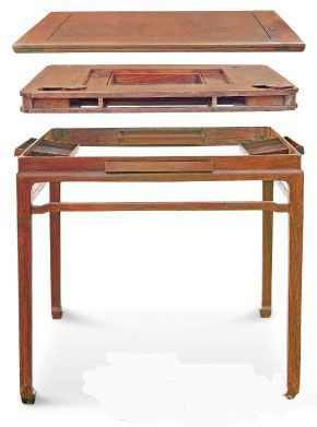 棋桌为方桌形,棋桌内装可移动嵌象牙双陆棋盘,两侧有狭长小室,四角有圆形小室并配白铜纽,束腰四面各安装抽屉一具。