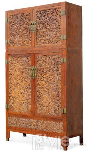 大四件柜又称“顶箱柜”,是非常实用的家具,成对陈设,颇有气势,所以又是身份和地位的象征。由于其体积硕大,一般房舍难以容身。随着社会的变迁,经常被拆散或改作它用,成对完整传世极为难得,存世量屈指可数。