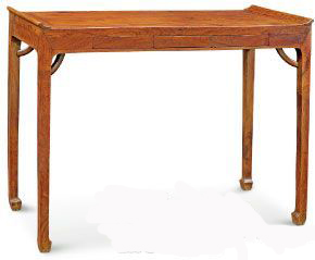 案形结体的家具常有翘头,桌形结体的家具很少见,而此桌小而有翘头。条桌上安抽屉,多为清式家具,明式条桌很少见,而此桌有扁小的暗抽屉三具。明式家具中有抽屉桌,但形式与此大异。因其造型及做法越出常规,只能视为条桌的变体,所见仅此一例。