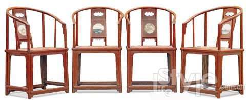 圈椅造型简洁明朗,身形挺拔,扶手不出头,与前足上端用烟袋锅榫卯结合,这是较为少见的做法。软藤座面,乘坐更加舒适。腿足之间加圈口,使椅子看起来十分俊秀。靠背板由三段攒成,中段圆开光内镶嵌精心挑选的圆形大理石,以表现四季不同的风光。四具一堂,完整传世,十分难得。