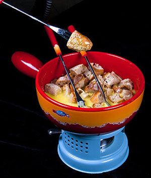 2.法棍面包块串上竹签,蘸上奶酪火锅酱食用;奶酪火锅酱也可以和蔬菜搭配,如西兰花、蘑菇等,但食用前需开水烫熟。