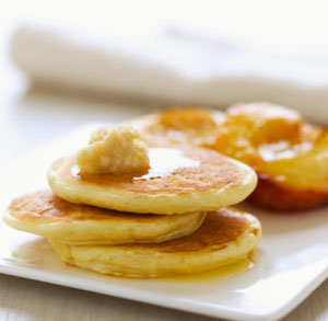 2.把不粘锅用慢火加热,一小勺黄油在锅上融化摊匀,将拌好的面糊放一勺在锅上,摊成荷包蛋大小,煎1分半钟,将美国切达奶酪切丝放在面饼上,再加少许面糊,翻个面再煎1分半钟,食用时拌糖粉少许即可。