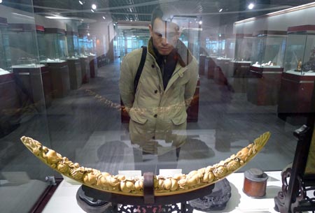 1月5日,在杭州举办的“海外回流艺术品精品展”上,一名参观者在欣赏清代象牙雕刻《五子闹福》。