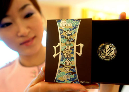 1月11日,在北京菜百商场,工作人员展示20g规格兔年铂金纪念章。