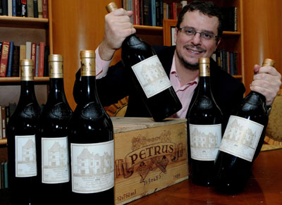 1月19日,媒体预展上工作人员正展示估价12万至16万港元的6瓶1.5公升装1989年奥比昂佳酿和一箱估价28万至40万港元的12瓶装1989年柏翠宝佳酿(中)。 1月21日至22日,Acker Merrall&Condit名酒拍卖行将在香港港岛香格里拉大酒店及香港君悦酒店举行2011年首场名酒拍卖会,将呈献共1200批来自显赫窖藏之顶级名酿,总估值高达七千万港元。