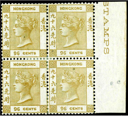 图为以640万港元成交的错色印刷香港维多利亚女皇像96先时橄榄棕色四方连带原胶邮票。