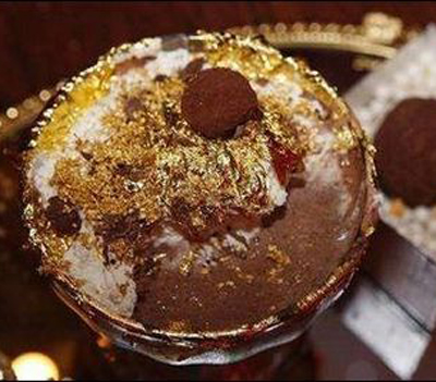 这款巧克力圣代冰激凌由纽约著名餐厅“奇缘3”店主斯蒂芬·布鲁斯和珠宝商合作创出,含有28种可可,其中14种全球稀有昂贵。圣代顶部生奶油覆盖一层金箔和售价高昂的松露巧克力,主体巧克力中混入5克可食23K黄金。