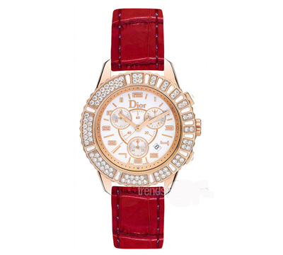 迪奥晶钻系列玫瑰金计时表直径38毫米,搭载ETA石英计时表机芯,玫瑰金表壳镶嵌钻石与白色蓝宝石水晶,黄金收边的白色烤漆表盘,红色鳄鱼皮表带搭配玫瑰金折叠表扣。售价:152000元