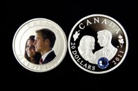 加拿大皇家造币厂日前发行了两枚英国威廉王子和凯特?米德尔顿结婚纪念币。