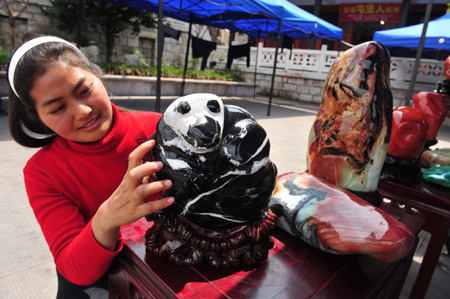 4月25日,在首届贵州安顺收藏石展上,一位市民正在观赏一块贵州北盘江观赏石。