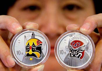 中国人民银行发行的中国京剧脸谱彩色金银纪念币(第1组)。这套纪念币一套3枚,其中金币1枚,银币2枚,均为中华人民共和国法定货币。新华社发 |