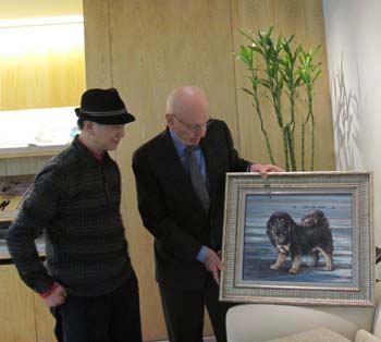5月4日,在美国纽约曼哈顿的新闻集团大厦,传媒大亨默多克(右)与中国著名的东方画獒大师林跃欣赏藏獒油画。林跃以画藏獒闻名中国画坛,近几年逐渐为世人所知。当默多克在网上看到林跃的藏獒油画后,表示一定要拥有一张藏獒油画,今日他如愿以偿。新华社发(李群子/摄) |
