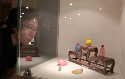 7月16日,“2011中国百年鼻烟壶展”在北京拉开帷幕。几百件鼻烟壶的收藏在展览中跃然呈上,种类齐全。展览以清代鼻烟壶精品和当代实力派内画大师黄三创作的内画鼻烟壶精品为主,满足了众多收藏爱好者对鼻烟壶历史的了解以及对现场展示的内画作法的了解。让更多喜爱本原文化的人对鼻烟壶的门类有了新的认识。