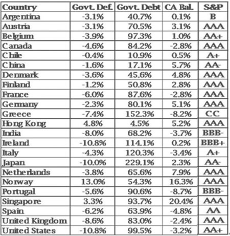 下表为23个国家的政府赤字、债务以及经常帐,下述的数字均为与其GDP的比例。最后一栏是它们的标普评级。