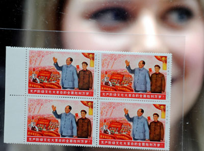 图为传媒预展上展示的1968年的未发行邮票“无产阶级文化大革命的全面胜利万岁”四方联,估价为750万至900万港元。
