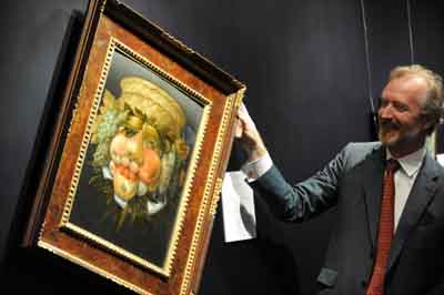 图为预展上展示的2012年1月25日将在纽约佳士得拍卖会上拍卖的朱塞佩·阿尔钦博托的油画《以水果构成的可逆转男子肖像》,估价300万至500万美元。