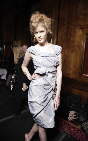 虽然以灰、蓝、紫、驼色为主色调的本季时装与韦斯特伍德过去的设计相比较为暗沉,但与原生态的民族风格图案搭配起来更显自然。不甘寂寞的韦斯特伍德还在其中穿插了饱满的橙色针织衫、丝巾和酒红色连裤袜,为寒冷的秋冬季节带来一丝暖意。