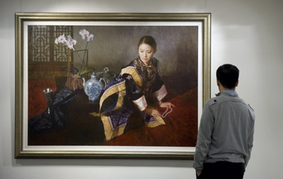 图为苏富比工作人员在观看画家陈衍宁的作品《夜深沉》,估价120万至180万港币。