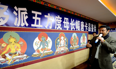 近日,由西藏拉姆拉绰唐卡画院绘制的长幅新唐卡“五度母像”以168万元价格,被藏族收藏家泽郎王青收藏,创下中国内地新唐卡价格新高。这幅唐卡用矿物、植物颜料及金汁绘制,长3.63米,高1米,用黄、蓝、白、绿、红五种颜色绘制。