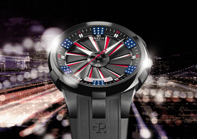 以美国国旗取材,重新诠释其驰名的双自动陀技术。设计师以解读美国国旗的独特结构来展现具气势之进化设计与来自漫画书的鲜明标志性形象,打造出「美国限量版」。插图中的女士身穿印有间条装饰及碎星图案的复古连身裙,造型飘逸,炽烈地成为众人焦点。