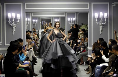 日前,众多中外名流、明星、时尚界人士云集上海外滩“罗斯福公馆”,观看由迪奥女装工坊首席设计师比尔·盖特领衔设计的2012春夏高级订制时装秀。图为模特在演绎迪奥的高级订制时装。
