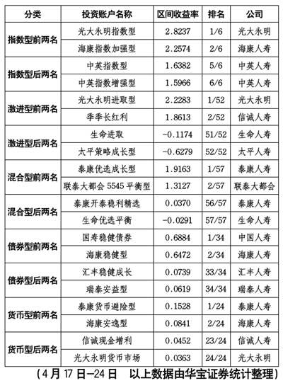 根据华宝证券统计,4.17日-4.24日,投连险各账户跟随大盘取得了较好收益,所有账户整体取得0.64%的平均收益,绝大部分账户实现正收益。但关注度较高的激进型账户平均收益仍未跑赢沪深300指数。