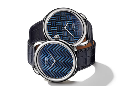d’Origny于1978年所创作的Arceau系列,延续该系列经典的不对称表耳造型,犹如方便环系马镫皮带的外型设计,呼应爱马仕马鞍制作的世界。然而,Arceau独特的斜体数字时标不见了,以便有更多空间将“麦杆镶嵌”工艺呈现在表盘上。蓝与黑组成的图案,在直径41毫米的白金表壳中,描绘出两款象征爱马仕标志的人字纹与小方形图样。 配备Vaucher专为爱马仕制作的H1928自动上链机芯,此两款新表拥有55