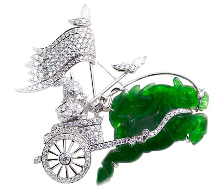 中国人认为马是行走在地上的龙,阳绿色翡翠战马神采奕奕,抬起前蹄好似带领千军万马勇敢迎敌,由钻石构成的骑士与战旗轮廓分明、立体富动感,值得人们崇拜与爱护。