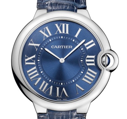 卡地亚蓝气球系列计时码表在经典外形轮廓之上,加入了计时复杂功能,在黑色格纹表盘三点及六点时标处,分别用计数分钟和秒钟的小针盘取代经典的罗马数字,日期窗格也随之移至九点时标旁。蓝宝石表冠左右安置着标准计时双按钮,按动之间,时间的流逝尽在掌握。
