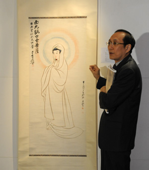 展出画作中,有一幅1941年设色纸本立轴《白描观音像》,为张大千初入敦煌时所画,与深受敦煌画法影响的后期作品在风格上有明显差别,具有较高的艺术收藏价值。画作被大师在上世纪60年代题款赠友,画与款年代相差十几年,也成为趣事一桩。具有较高价值的还有1949年张大千初到台湾时,为答谢友人之子帮忙安顿而写赠的水墨纸本镜框《自画小像》,仅有11厘米乘7.8厘米大小,是现今存世尺幅最小的张大千自画像。