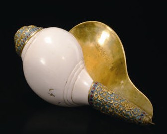 白色海螺法器在远古时期就作为能量、权威和君权的象征,它的响声在古代史诗中能驱逐恶灵、转移自然灾害和吓走毒害人的万物。法螺亦为法会时吹奏的乐器之一,佛经上讲,释迦牟尼说法时声音洪亮,犹如大螺贝之声响彻四方,使闻声者可以驱魔,灭诸罪障。有清一代统治阶层对于法螺一直有特殊的喜好,女真(满)族人还在关外时期,即使用从蒙古族传入的法螺,当时为一种军令工具,以号令和鼓舞士兵冲锋,并在心理上给交战敌方造成威慑。定鼎中原后,海螺主要作为军队操演和皇帝大阅的军乐器,乾隆二十四年(1759年)修成的《皇朝礼器图式》中称海螺为“海蠡”。入关后清帝对于海螺的喜爱并未消减,更主要的是与宗教相连。清帝一方面是藏传佛教忠诚的皈依信徒,另一方面利用宗教信仰来统治和安定国之疆土。