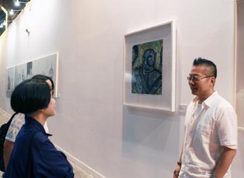 日前,由上海艺博画廊等发起成立的“画廊联盟”,在上海红坊文化艺术社区推出了“文化上海:朝向未来的回归2012画廊联盟展”研讨会活动。图为一位参展的艺术家在与观众交流。资料照片 |