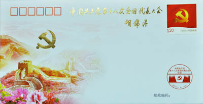 为庆祝中国共产党第十八次全国代表大会召开,中国邮政于11月8日发行《中国共产党第十八次全国代表大会》纪念邮票1套2枚、小型张1枚和印有胡锦涛总书记题词的《中国共产党第十八次全国代表大会》纪念封一枚。该套邮票图名分别为“科学发展”和“继往开来”,面值均为1.20元;小型张图名为“欢庆”,面值为6元。