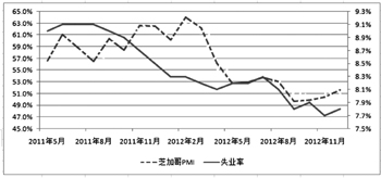 目前来看,美国经济正处于稳步复苏阶段。在连续实施量化宽松政策之后,美国一些重要经济数据显示其复苏势头良好,PMI指标开始回升,已连续两个月处于50荣枯分界点之上;失业率也持续下降,并处于低位运行;而投资者普遍关注的财政悬崖,也如预期般得到了缓解,暂时不会对商品市场构成冲击。