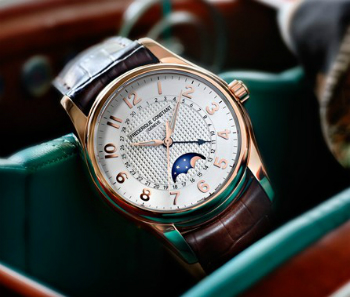 精钢表壳版本配以高贵黑色真皮表带以及折叠带扣。FC-330腕表同样备有43mm直径玫瑰包金版本,银色表盘与中央guilloché纹饰对比强烈,配以人手装嵌的镀金阿拉伯数字。腕表其余规格一如精钢版本,