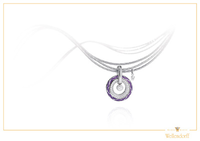 魔幻紫晶护身符吊坠 Wellendorff全新魔幻紫晶系列护身符吊坠迷人而妩媚,不仅因为它充满魅惑的色彩,同时也因为它的9种不同佩戴方式。魔幻紫晶护身符吊坠的外环由神秘的紫色与至纯的18k白金相互辉映,构成Wellendorff经典风格的抽象羽翼,同时,也为中心的单颗钻石和整环镶钻的内环增加了现代时尚的气息。中心的独立钻石与整环镶钻的内环都悬挂于一个精致的珠宝弹簧卡夹之上。谨小慎微又精细别致的Wellendorff金匠艺术可以在其精确加工的闭合机制中得以窥见:即便是在打开的时候,依旧可以安全可靠地保证圈环的位置而不会掉落。