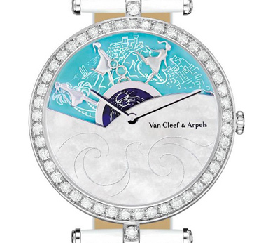 Arpels(梵克雅宝)的诗意复杂功能系列腕表。梵克雅宝的腕表早已超越了单纯的对审美的追求和技术创新的范畴,她总是能以浪漫动人的创想巧妙的诠释时间之美,这种诗意的诠释已成为梵克雅宝的真正标志,没枚腕表的设计均力求将这种诗意变为可视的艺术品,向人们诉说着如梦似幻的动人故事。