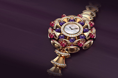 本系列运用虚实相间的形态对比,以细致的立体杯状花诠释扇子的情致意态。盛开的优美花瓣点缀造型华丽的腕表,穿插铺镶闪亮的钻石。白金款式则全面铺镶钻石,精致的扇子于是形成优雅的花串,隐约流露几分东方韵味,赋予高雅的闪亮效果。此外,本系列其他款式在设计上也有令人惊喜的变化:色彩欢快的圆珠形紫水晶、橄榄石或红碧玺,烘托着镶嵌于其间的小钻石。自1950年代末以来,BVLGARI便以运用凸圆形切割享有盛名。而在这次的设计上,彩色宝石形态充满灵奇之趣,为珠宝作品赋予独特的丰盈感与现代风味。每一颗宝石都在中央琢出一个凹槽,以便镶入钻石。此一工序看似简单,实则须有高超技巧才能保持宝石完美无缺。小扇子排列成形,有大有小,或上下颠倒,或似倾泻而下的彩色瀑布,变化无穷的几何构造宛如一串串催眠音符,令人目不暇给。