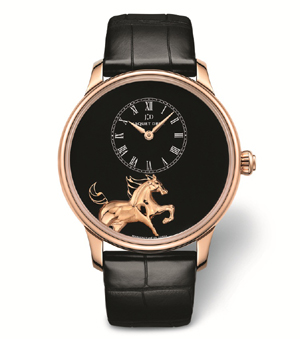 2014年,中国迎来马年,马不仅是活力与勇气的象征,更是今年雅克德罗(Jaquet Droz)生肖腕表的主角。该品牌推出的三款专属腕表皆由雅克德罗的手工艺大师采用独一无二的精湛工艺打造而成。镌刻、微绘……每一匹骏马的肌理、马鬃都刻画得非常细致,惟妙惟肖。表盘上的骏马矫健俊逸,姿态潇洒,仿佛脱离了缰绳的束缚,在辽阔的原野上掣风而驰。