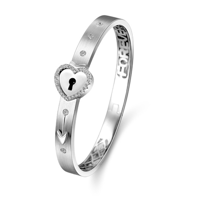 18K金钻石手镯更配有别出心裁的小锁开关结构设计,必须以18K金钻石吊坠上的钥匙方能打开,象征恋人的两颗心紧紧相扣,将那份浓情蜜意幻化成爱的盟誓,让爱情时刻保持历久常新。