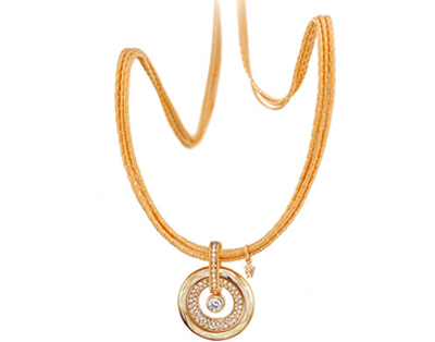 华洛芙全新“真正的喜悦”系列护身符吊坠从两方面捕获了佩戴着的心-从容挑选自己深爱的幸运色和19种奇妙的佩戴方式。真正的喜悦护身符吊坠的外环由活泼时尚的颜色与至纯的18k黄金相互辉映,构成华洛芙经典风格的抽象羽翼,同时,也为中心的单颗钻石和整环镶钻的内环增加了现代时尚的气息。中心的独立钻石与整环镶钻的内环都悬挂于一个精致的珠宝卡扣之上。每个护身符环都用丝绸流苏装饰,赋予整个项链灵动活泼的韵味和宛如阳光般的温暖。佩戴者可以在任何时候根据不同的心情改变护身符吊坠的形象,既可以挑选您自己的幸运色,也可以变换为时尚简约又经典复古的白色珐琅面,亦或者是选择闪闪发光的流苏吊坠。如此的多面性让拥有这款护身符吊坠的女性无比幸运。