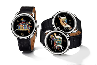 漆绘工艺腕表骏马奔腾的图案,灵感来自爱马仕其中一款具代表性的餐瓷系列–Cheval d’Orient(东方骏马)。工匠透过这三枚Arceau Cheval